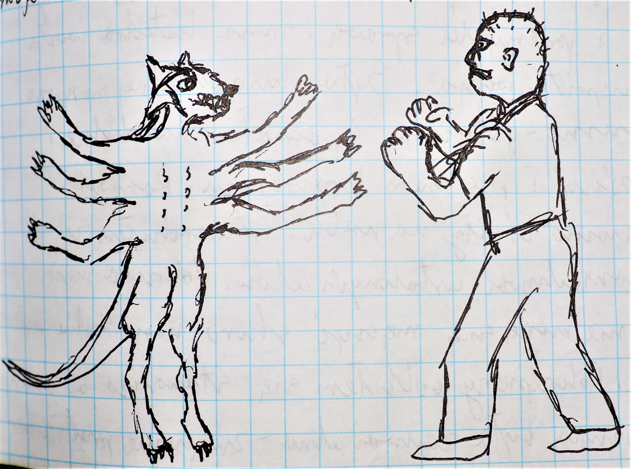 Byłem zbyt zszokowany, by z tym polemizować, więc posłusznie wycofałem się przemyśleć sytuację gdzieś indziej. Połączyłem kropki i nagle stało się zupełnie jasnym, że sześcioręka istota, którą nieopatrznie przygarnąłem pod własny dach nie jest zwyczajnym kotem. Była czymś złym, może demonem, intruzem z innego wymiaru, który wcale nie miał zamiaru się zadomowić, oswoić i bronić domowego miru. Nie miałem wątpliwości, że muszę jakoś pozbyć się niechcianego gościa. Zdenerwowany na własną nieopatrzność i nieostrożność, poprzez którą sprowadziłem zagrożenie na własną rodzinę, postanowiłem działać stanowczo i natychmiast. W złości wtargnąłem do pokoju zajmowanego przez nadnaturalnego okupanta i z zamiarem użycia brutalnej siły w razie takiej potrzeby, z zaciśniętymi pięściami zacząłem zbliżać się do wrogiego bytu, teraz wylegującego się na kanapie. Moją pewność siebie zachwiał jednak fakt, że z każdym kolejnym krokiem w jakiś magiczny sposób robiłem się coraz mniejszy i mniejszy tak, że gdy w końcu stanąłem przed kotem, ten jawił mi się jako monstrualnych rozmiarów bestia spoglądająca na mnie z równie olbrzymiej kanapy. Zostałem jedynie obdarzony pogardliwym uśmieszkiem, po czym musiałem wycofać się pokonany. Na szczęście wracając moje rozmiary wróciły do normalności.