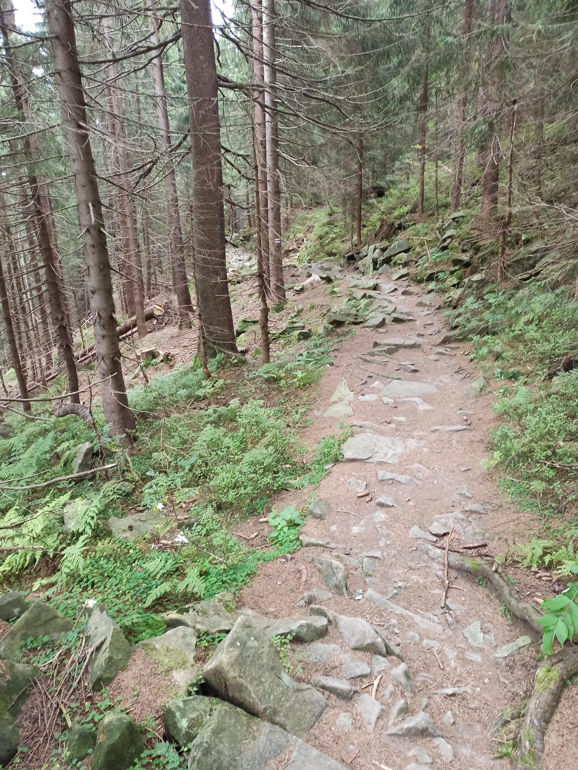 Z rozległych hal szybko zszedłem między gęste lasy, które malowniczo ciągnęły się w dół zbocza, gdzie też stale kierowała mnie kamienna, wijąca się ścieżka. Długo tak schodziłem w dół, co zawsze trochę mnie zniechęca, bo z tyłu głowy rośnie świadomość, że całą tą straconą wysokość będzie trzeba w końcu z powrotem nadrobić. Zszedłem tak aż do poziomu ulicy wiodącej do bardzo pokaźnego przejścia granicznego, za którym była już Słowacja. Poza tym stały tam jakieś małe budki, gdzie zakręciłem się licząc na uzupełnienie wody i może jakiś oscypek, ale niestety wszystko było zupełnie opustoszałe.
