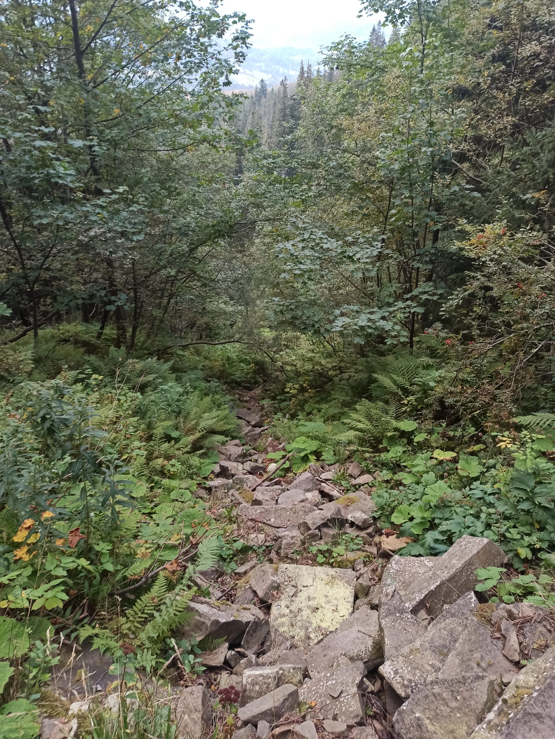 Od tego momentu czas już bardzo szybko mi mijał wraz z pokonywaną drogą. Czułem, że wykonuję swoje zadanie jak krocząca maszyna i mimo wyraźnego zużycia stawów i braku możliwości zwilżenia swoich podzespołów byłem pewny, że bateria posiada wystarczający zapas energii. Udało się wręcz zdystansować osobistą perspektywę od wszelkich przejawów postępującego znoju, z którym i tak nie było już nic do zrobienia i przyjąć postawę spokojnego oczekiwania na nieuchronnie zbliżający się cel. Stan pełnej akceptacji swojego położenia zaowocował i w miarę bezboleśnie, nie wiadomo kiedy, przekroczyłem granicę Babiogórskiego Parku Narodowego.
