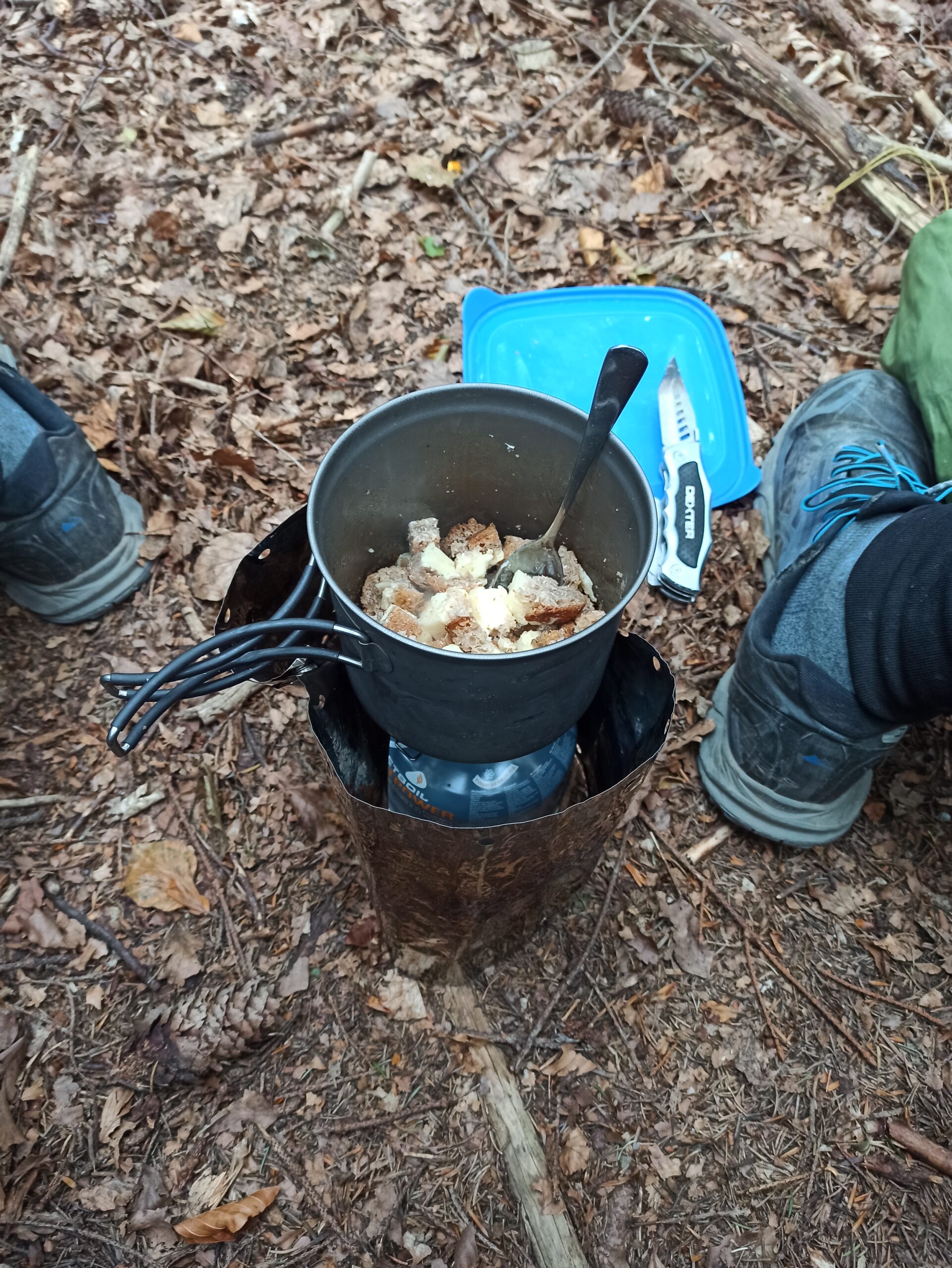 Poszedłem więc dalej dłuższą i pewniejszą opcją by po chwili już całkowicie zanurzyć się w odmładzającej, pełnej wigoru energii, którą zdają mi się emanować bukowe lasy. Ich zieleń jest jakaś taka bardziej przejrzysta, nasycona i przestrzenna. Stwierdziłem, że to dobre otoczenie, aby poświęcić w nim chwilę na regenerację i posiłek. Z ulgą rozrzuciłem klamoty i czym prędzej zacząłem składać swoją mini kuchenkę gazową. Nie pisałem tego wcześniej, ale poprzedniego dnia w schronisku, rozmawiając z mamą został mi przekazany cudowny sposób na nadanie zdechłym już trochę kanapkom z serem drugiej młodości. Jako że nie szczędziłem im ani masła, ani sera, to wystarczyło pokroić je w kostkę i wrzucić do grzejącego się na ogniu garnuszka, aby uzyskać ciepłą, skwierczącą i aromatyczną masę grzankową. Jakie to było dobre. Od tej pory już ani razu nie zjadłem na tej wyprawie zimnej kanapki. Pozwoliłem sobie na jeszcze chwilę błogości w bezruchu, ale czas gonił i każde kolejne 10 minut przestoju mogło zadecydować o tym, czy ostatni fragment drogi do schroniska będę przemierzał w świetle lub o zmroku. Nie mniej te dwie kanapki transformowane w grzankową masę naprawdę sprawiły, że poczułem się jak młody bóg i po załadowaniu manatków wypełniony pozytywną energią pognałem dalej.