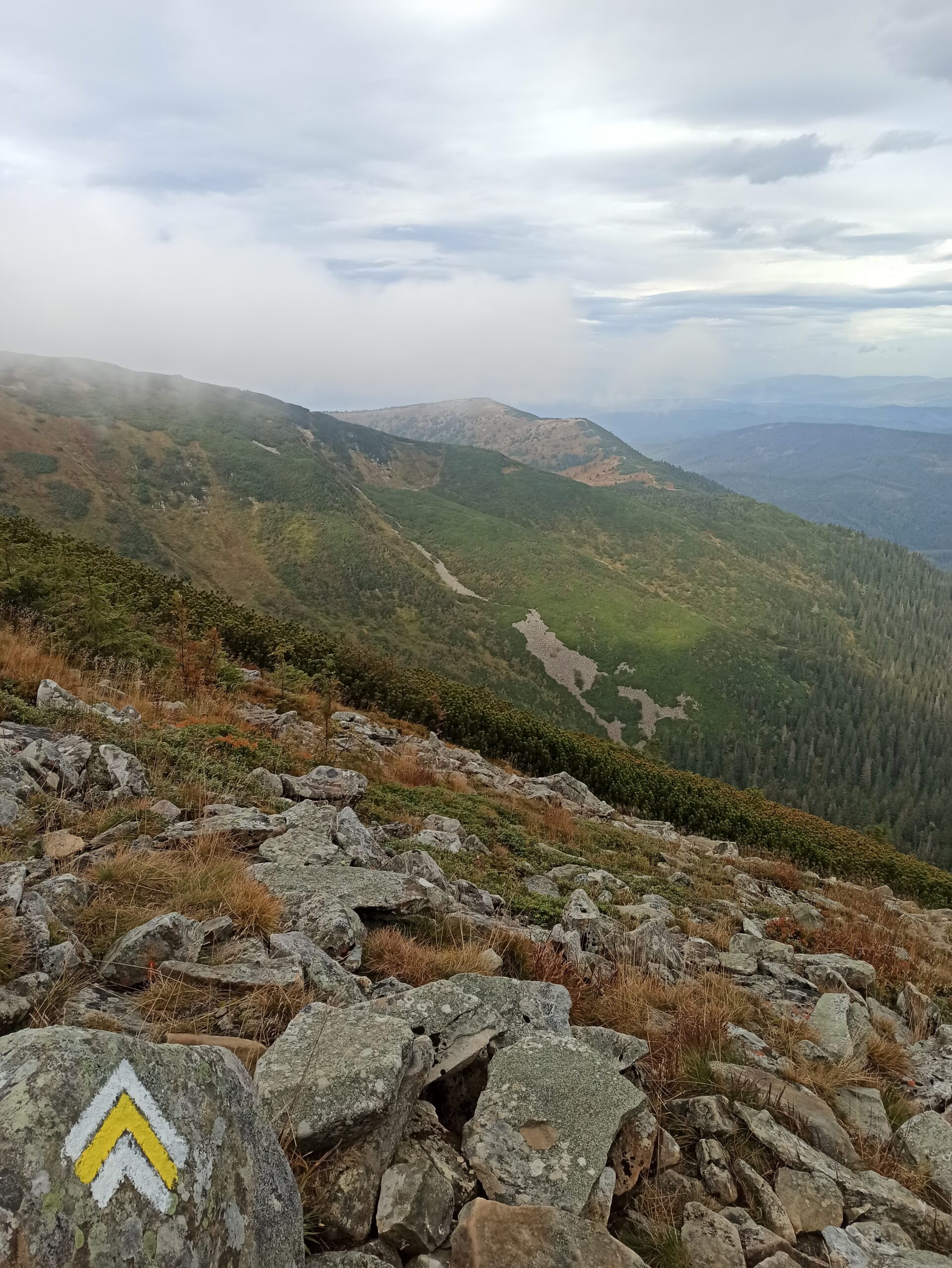 Podejście było dosyć ostre, ale początkowo nie było tak źle. Wiatr wyraźnie nadchodził zza przeciwległej ściany, co dobrze wizualizowały poszarpane chmury ciągle przewalające się wysoko nade mną przez szczyt na moją stronę. Wyglądało to dosyć ciekawie, ale przede wszystkim oznaczało, że jestem w miarę osłonięty od głównego ciągu i tylko sporadycznie osłabione podmuchy spadały w dół zbocza na moją postać. Gorzej czułem się z samym ciężarem plecaka, który teraz, przy takiej ekspozycji i nachyleniu zbocza, na które się wspinałem, bardzo wymownie ciągnął mnie prosto w dół i zaburzał i tak niepewny balans na śliskiej skale. Czułem po spiętych mięśniach w całym ciele, jak bardzo nienaturalną dla siebie czynność wykonuję i z jednej strony cieszyła mnie przygoda, ale z drugiej musiałem przyznać się przed sobą, że po prostu trochę się boję i ten strach nie jest dla mnie niczym przyjemnym.