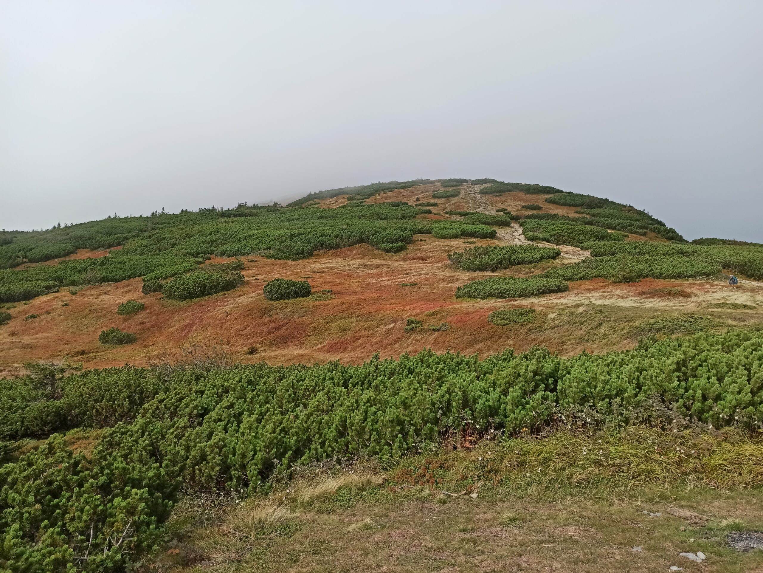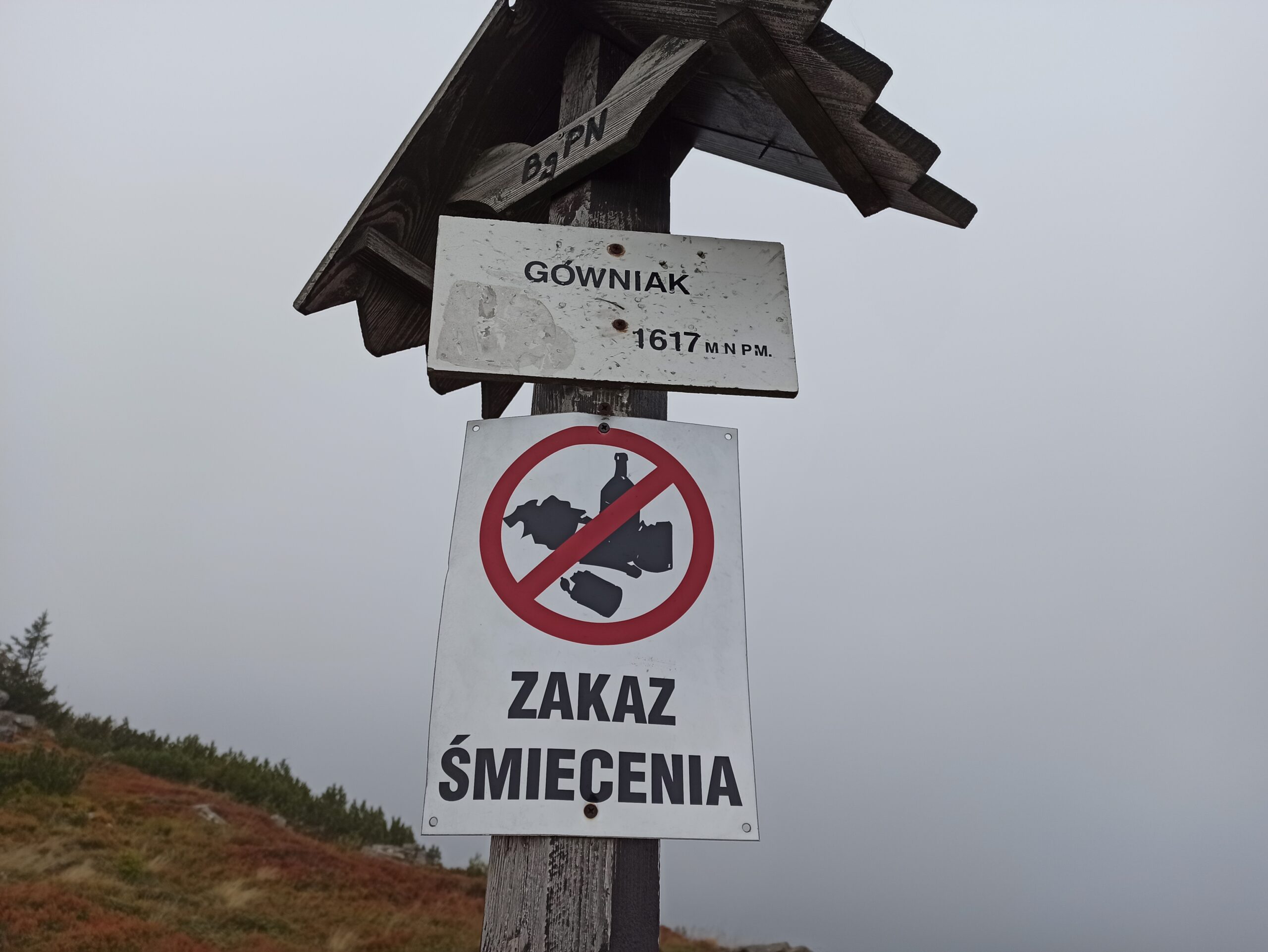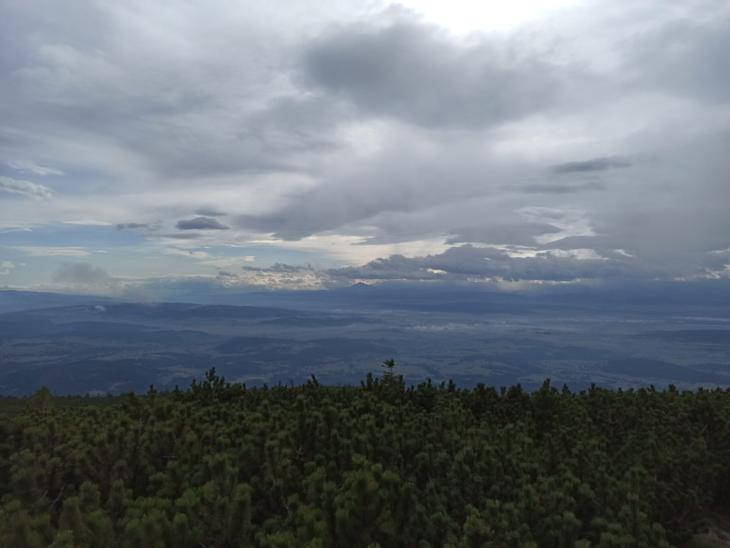 Atrakcyjność dłuższego pobytu w tych warunkach nie przedstawiała zbyt dużej wartości, więc po uzupełnieniu płynów przyjąłem z powrotem pozycję obronną na nisko ugiętych kolanach i drobnym kroczkiem ruszyłem w dół góry czerwonym szlakiem. Po zejściu około 100 metrów w dół dotarłem na garb o uroczej nazwie „Gówniak”, gdzie pogoda dawała już odrobinę więcej wytchnienia. Byłem w stanie stać w pozycji mniej więcej wyprostowanej, a także raz na jakiś czas faktycznie dostrzec strzęp niesamowitej panoramy przez chwilowy wyłom w chmurach. Przede wszystkim, ku mojej wielkiej ekscytacji, po raz pierwszy (na tej wyprawie) zobaczyłem majaczący daleko na południu, majestatyczny łańcuch Tatr. Czułem się jak Frodo spoglądający na odległe granice Mordoru. Ciemniejące pod chmurami, olbrzymie masywy surowej skały piętrzące się jedna na drugiej, jakby rozsadzała je ich własna potęga. Ach, doznawałem wtedy iście poetyckich uniesień wlepiając wzrok w tę, sprawiającą wrażenie mitycznej, krainę za każdym razem, gdy choć na chwilę wyłaniała się z mroków burzliwej pogody.