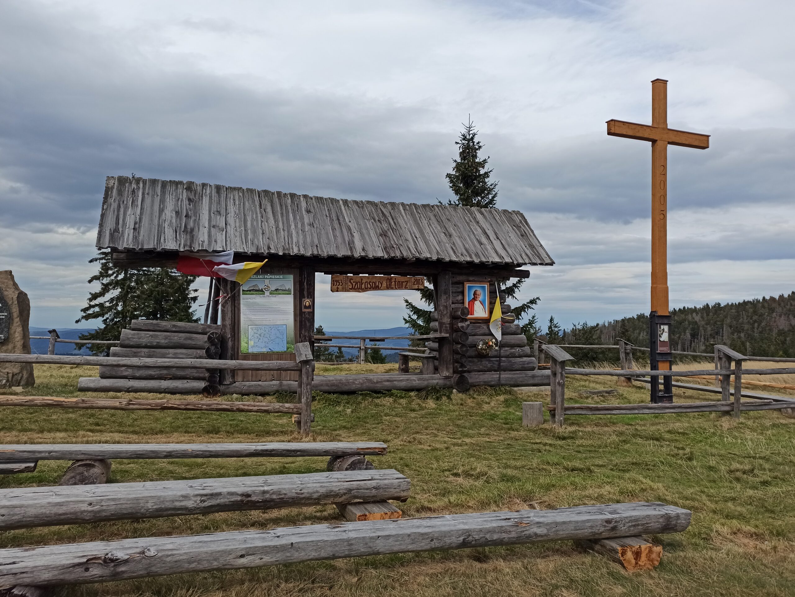 Na polu namiotowym nikogo nie było i miałem nadzieję, że tak pozostanie. Zwłaszcza w przypadku odniesienia grzybowego sukcesu czułbym się lepiej z zapewnioną odrobiną intymności. Kiedy mój nylonowy kokon został ostatecznie przytwierdzony do podłoża nie miałem już innych wymówek – zakasałem rękawy i ruszyłem. Najpierw w stronę znaku upamiętniającego wizytę samego Papieża Polaka na tych szlakach. Pomyślałem, że pod takim potężnym patronatem ziemia z pewnością będzie bardziej skłonna zrodzić świętą grzybnię, więc zacząłem się rozglądać zaraz za znakiem powoli kierując się w głąb łąki. Ostatecznie szybko zszedłem najdalej jak się da, aby nie było mnie jednak widać z głównej ścieżku. Pełna oczywistość moich zamiarów ujawniająca się w charakterystycznym pełzaniu na czworaka z nosem w trawie była dla mnie odrobinę krępująca.