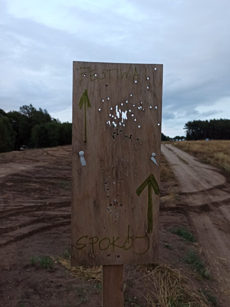 Przygotowani na ile się dało ruszyliśmy w nieznane ustawiając na GPSie malutką kaszubską wioskę za cel – Dąbrowa koło Stężycy. Droga wiodła przez malownicze pola i lasy, aż ostatni zakręt sygnalizowała charakterystyczna kapliczka z Matką Boską. Od tego momentu jechało się już praktycznie polem do drewnianej tabliczki z namalowanym na niej charakterystycznym motylkiem, który ostatecznie wskazał nam, że o to wkroczyliśmy na teren festiwalu.