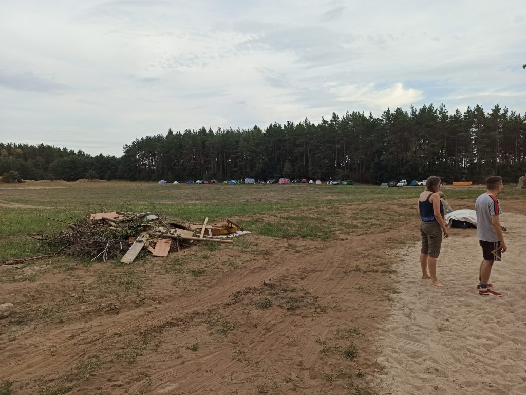 Przy czym „teren festiwalu” to może w przypadku pierwszej edycji trochę za dużo powiedziane. Raczej „muzyczny piknik” lepiej oddawałby charakter tego, co zapamiętałem (aczkolwiek zaznaczam, że szczegóły są już mocno zatarte). Ot pole, na którym nieregularnie rozbitych jest pewnie 20-30 namiotów, plus nieduża scena w charakterystycznym zagłębieniu za górką. Czy było coś jeszcze? Jakaś latryna, jakiś polowy prysznic, może buda z grillem i piwem, ale pewny nie jestem. Co druga osoba, którą mijałem była mi w jakiś sposób znajoma, co wynikało z pantoflowej formy promocji wydarzenia – bez oficjalnych ogłoszeń, a z polecenia od ziomka do ziomka, a więc towarzystwo charakterystyczne dla większości trójmiejskich imprezek awangardowo-artystycznych. Do tego dużo piesków i trochę dzieci. No sielanka.